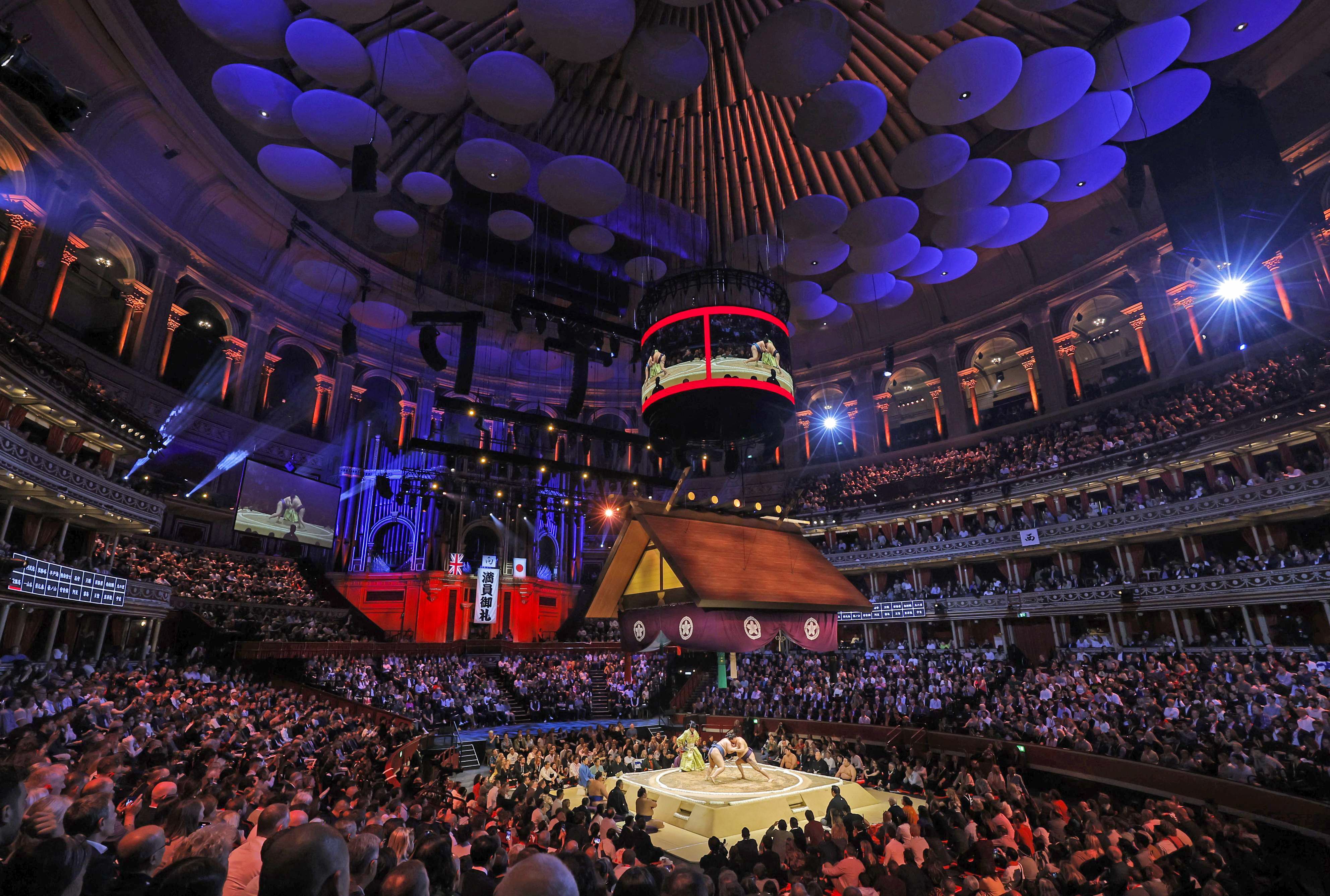 Spectators watch a bout during the second day of the five-day Grand Sumo Tournament at the Royal Albert Hall in London on Oct. 16, 2025. (Kyodo)