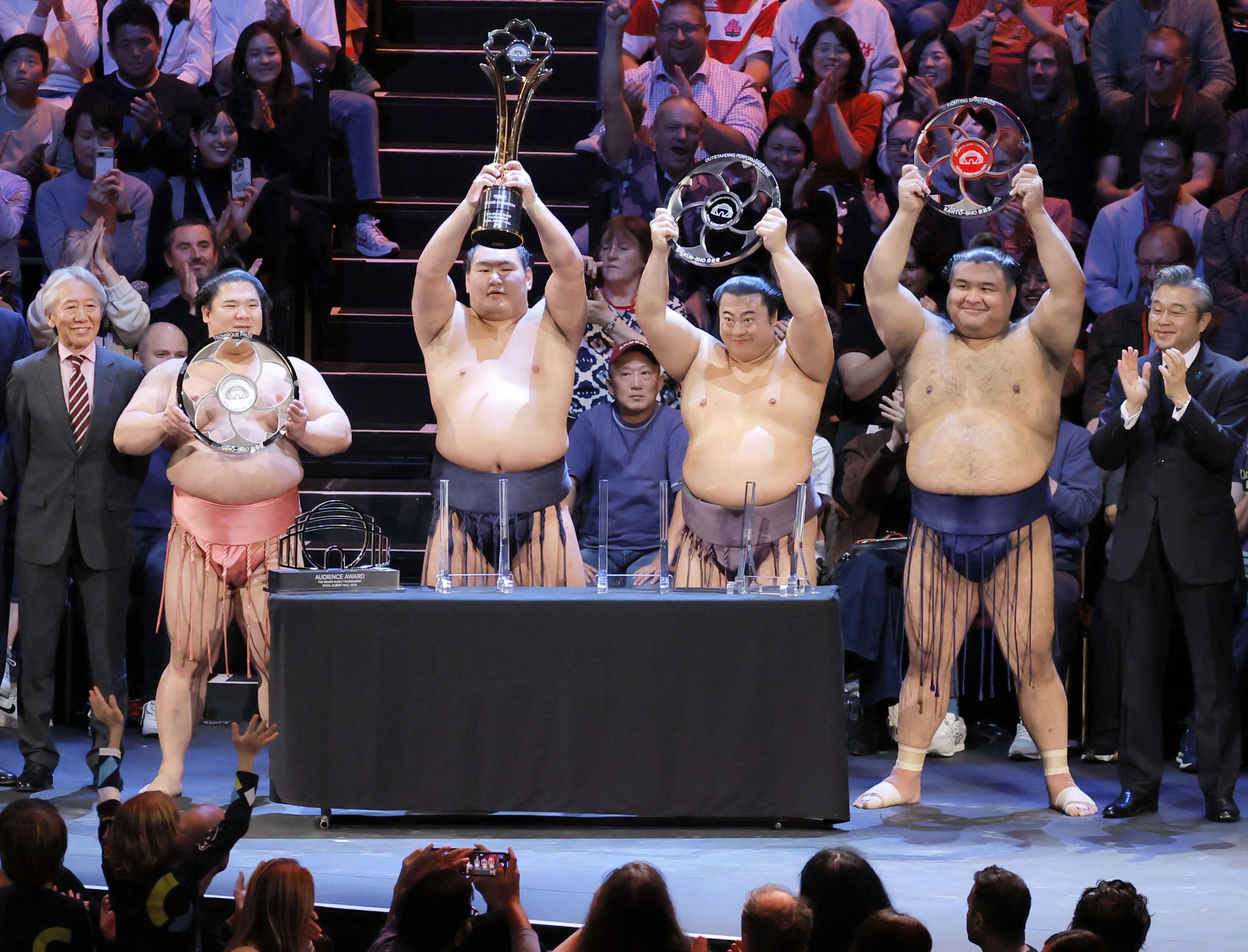 (front, from L) Ura, yokozuna Hoshoryu, Sarutobi, and Takayasu acknowledge the crowd after receiving their respective awards at the closing ceremony of the five-day Grand Sumo Tournament at the Royal Albert Hall in London on Oct. 19, 2025. (Kyodo)