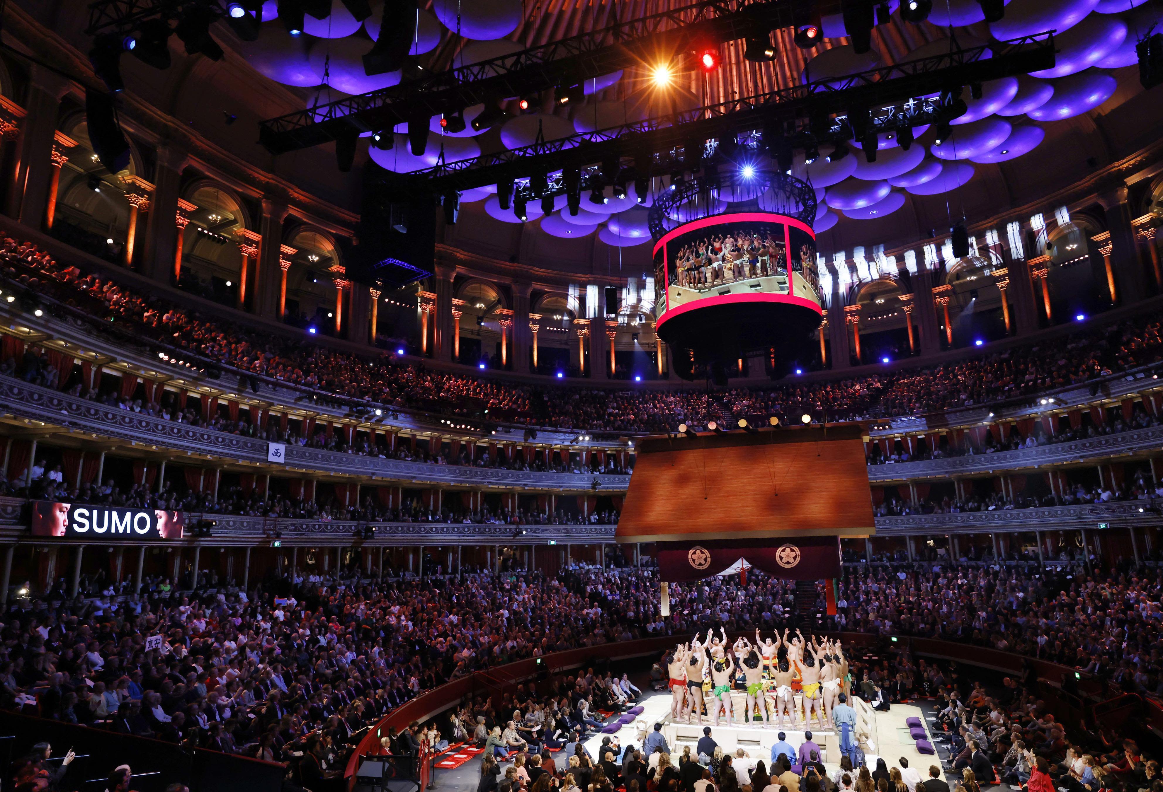 A sumo ring is under reconstruction at the Royal Albert Hall in London on Oct. 13, 2025, ahead of a five-day sumo tournament from Oct. 15. (Kyodo)