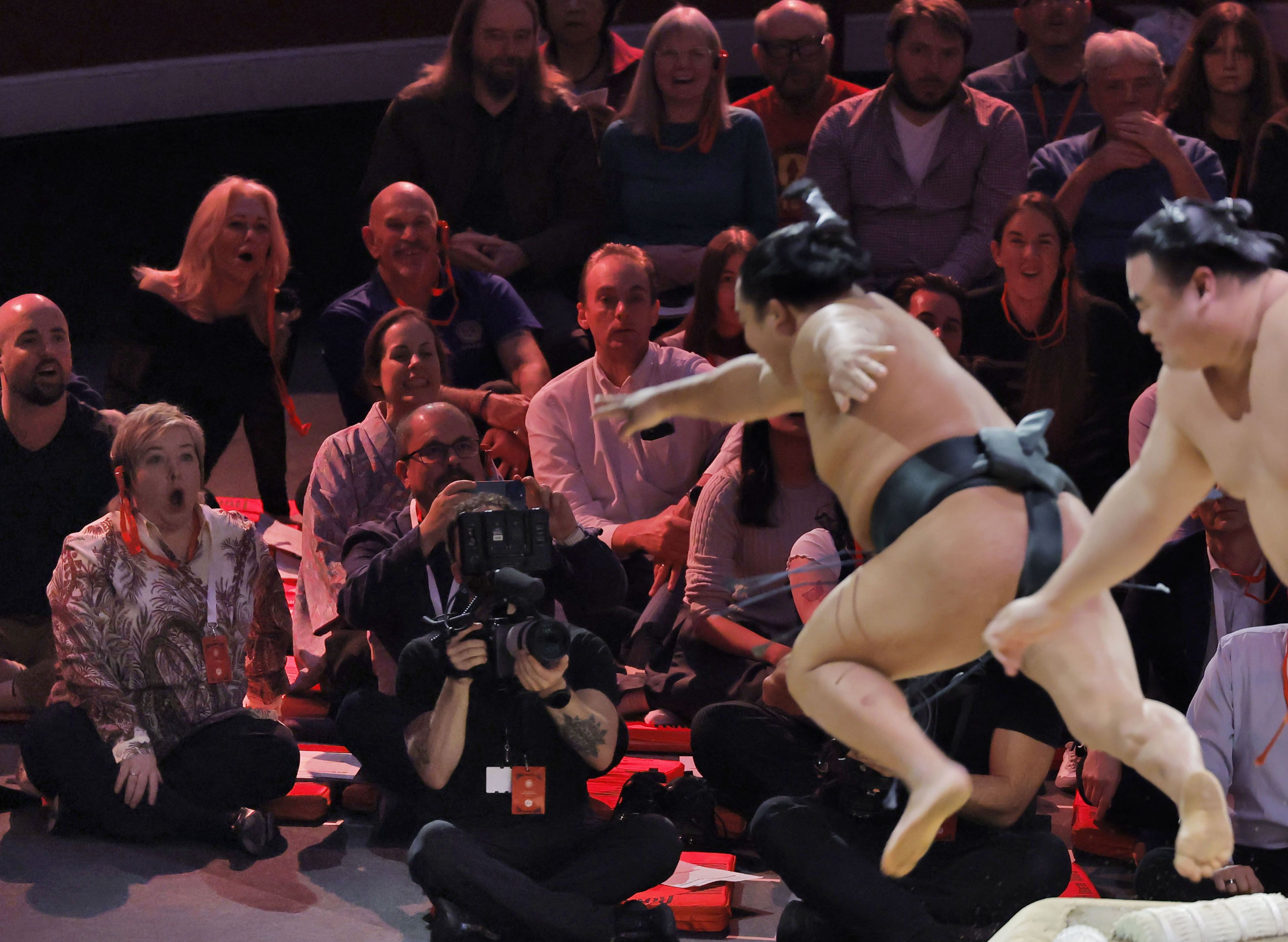Spectators react as a sumo wrestler is thrown toward them on the second day of the five-day Grand Sumo Tournament at the Royal Albert Hall in London on Oct. 16, 2025. (Kyodo)