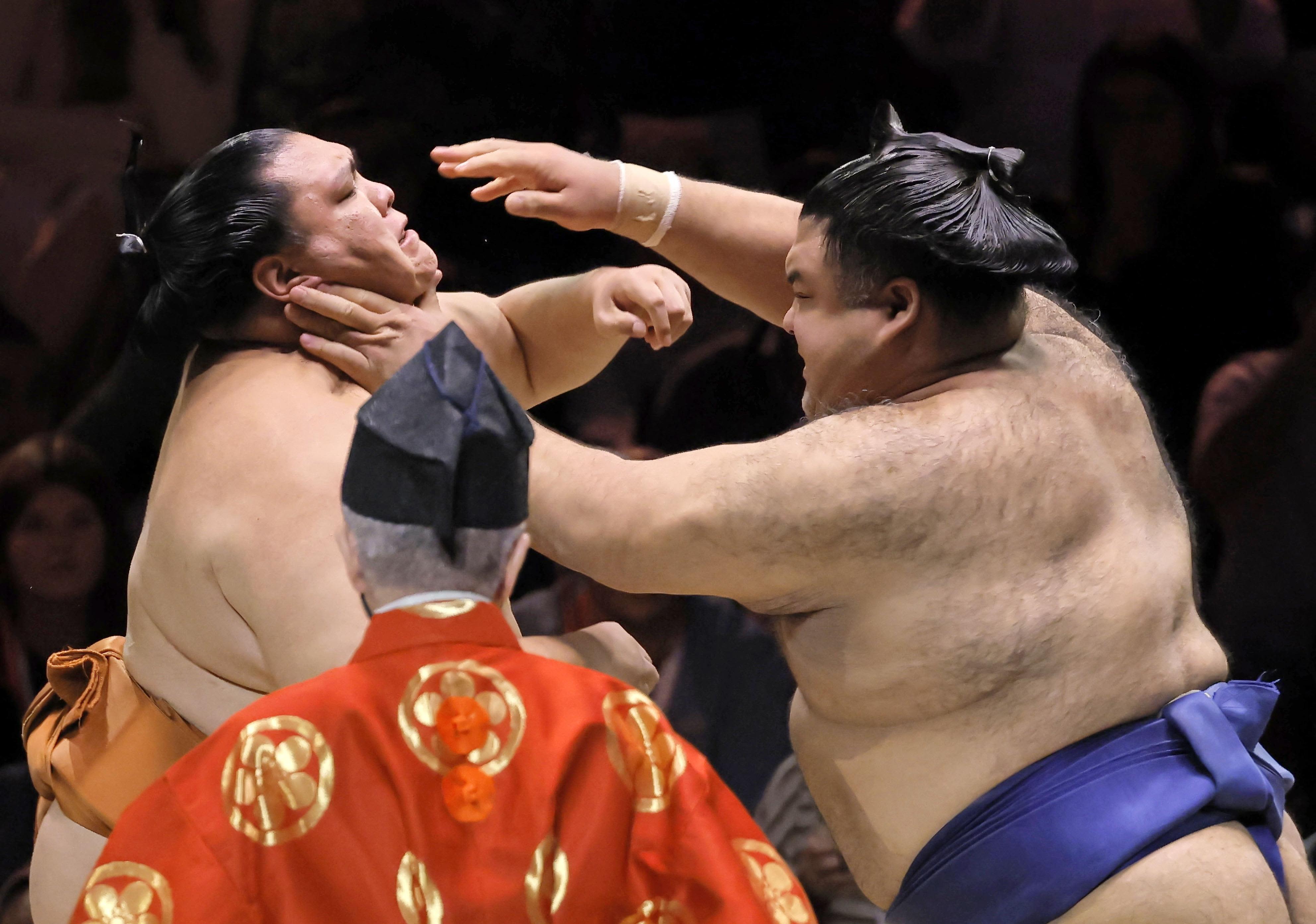 Takayasu (R) attacks Mitakeumi during the third day of the five-day Grand Sumo Tournament at the Royal Albert Hall in London on Oct. 17, 2025. (Kyodo)