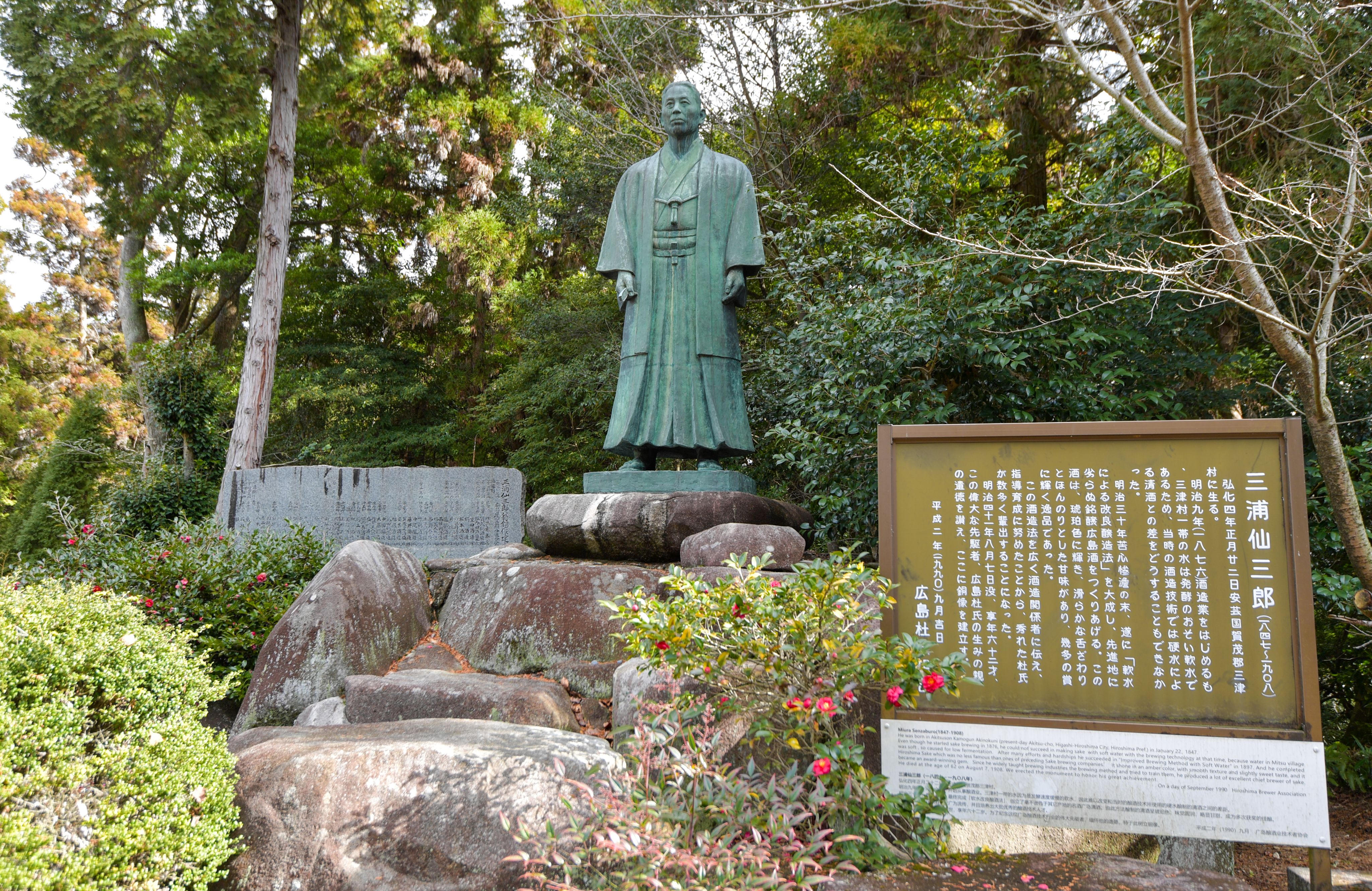 A statue of Senzaburo Miura stands in the grounds of Sakakiyama Hachiman Shrine.