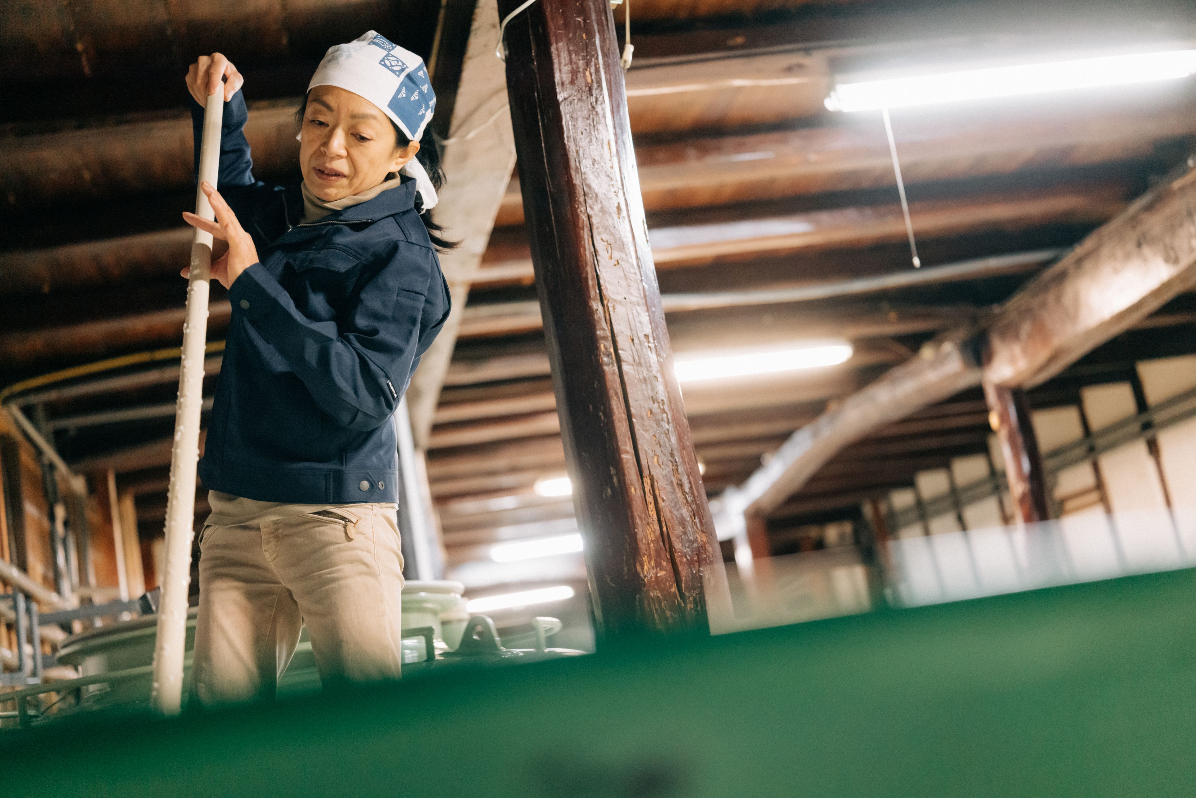 Inside the koji muro, the work of separating rice grains is hot, sweaty and hands-on. In the fermentation room, staff plunge poles deep into tanks to stir the sake mash within, and in doing so release fruity aromas.