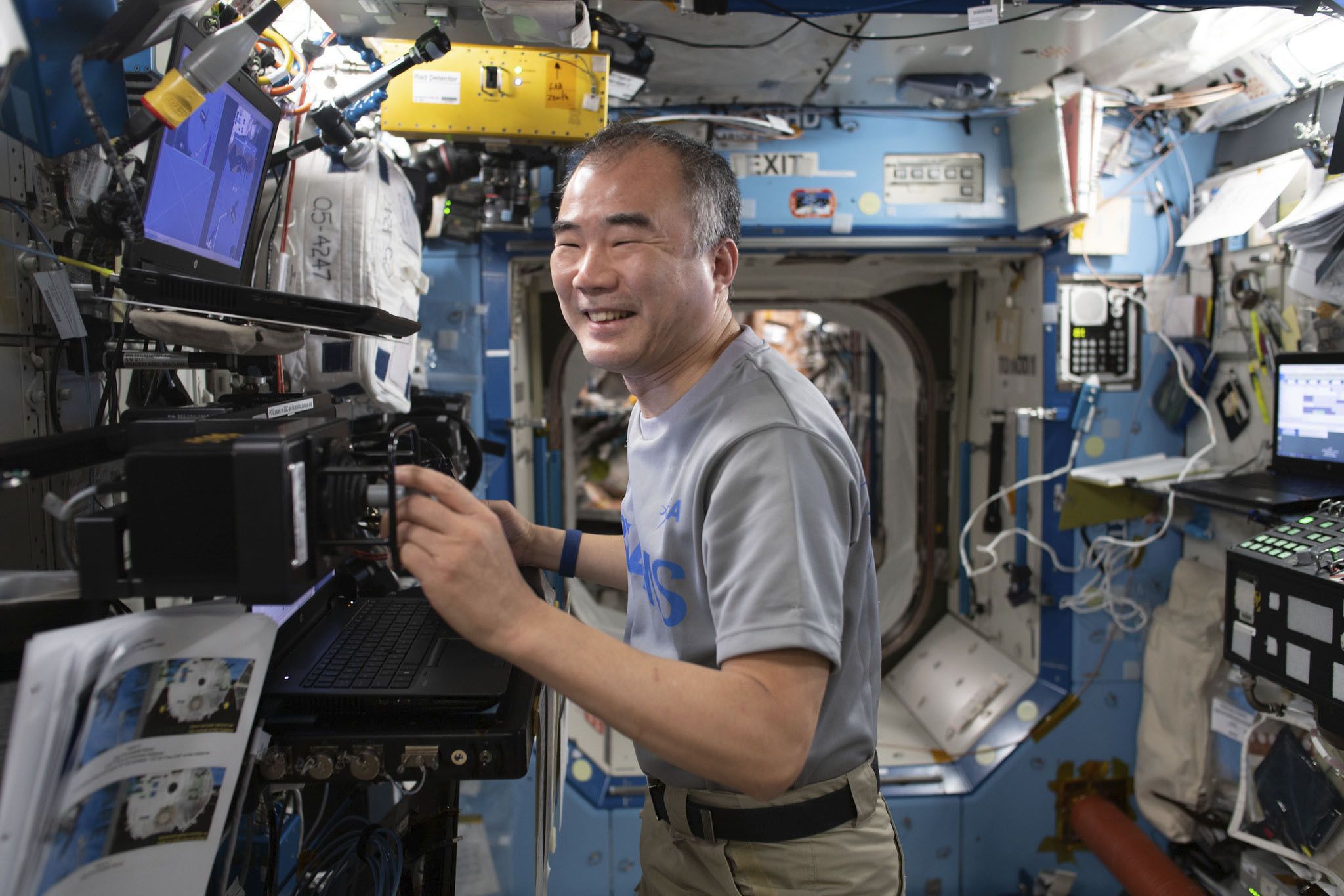 Soichi Noguchi works on board the International Space Station in 2021. (Courtesy of NASA)