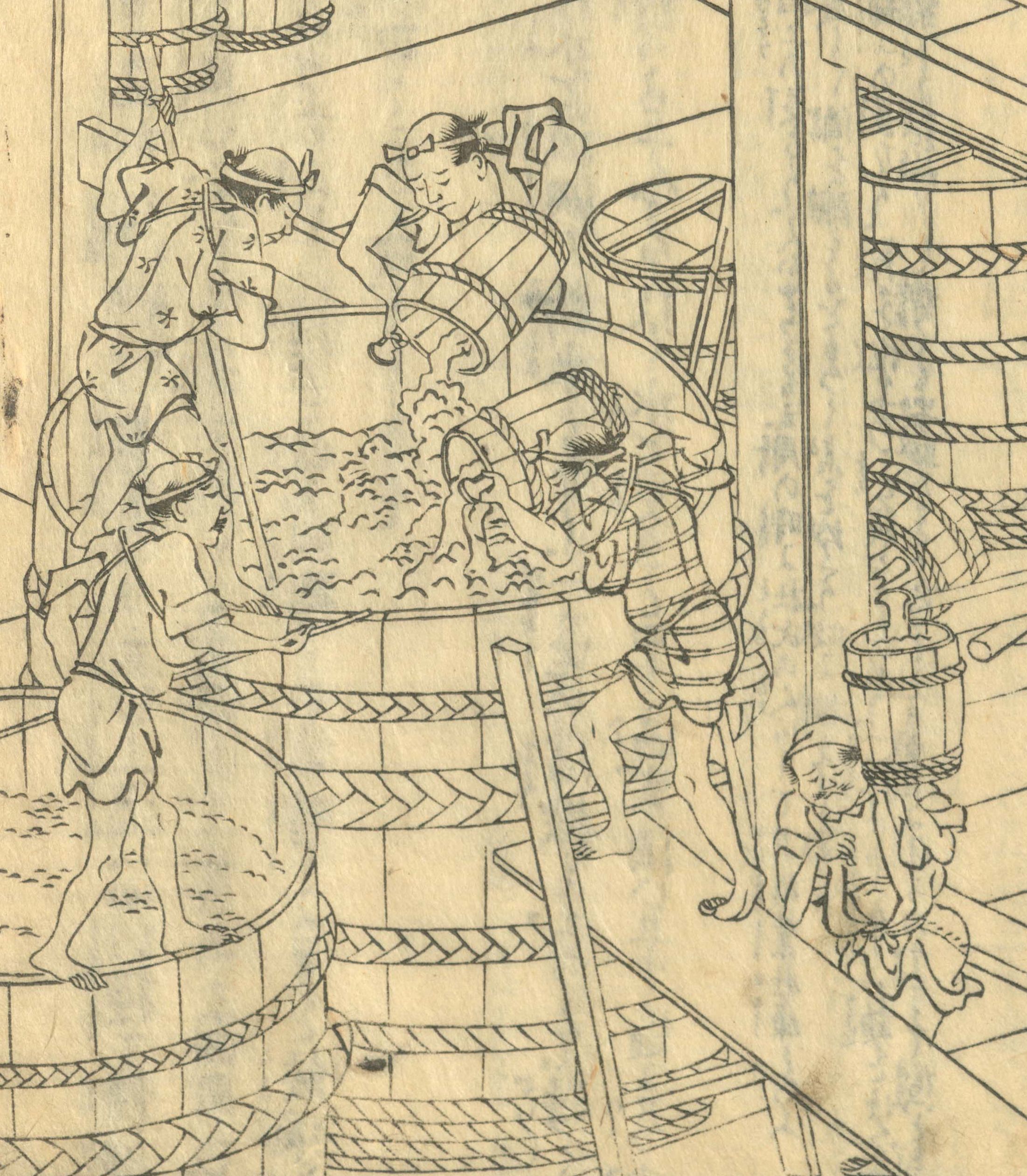 Photo shows part of an impression of sake-brewing from the book “Nihon sankai meisan zue,” a guide to Japanese products first published in 1799. (Courtesy of the National Institute of Japanese Literature)