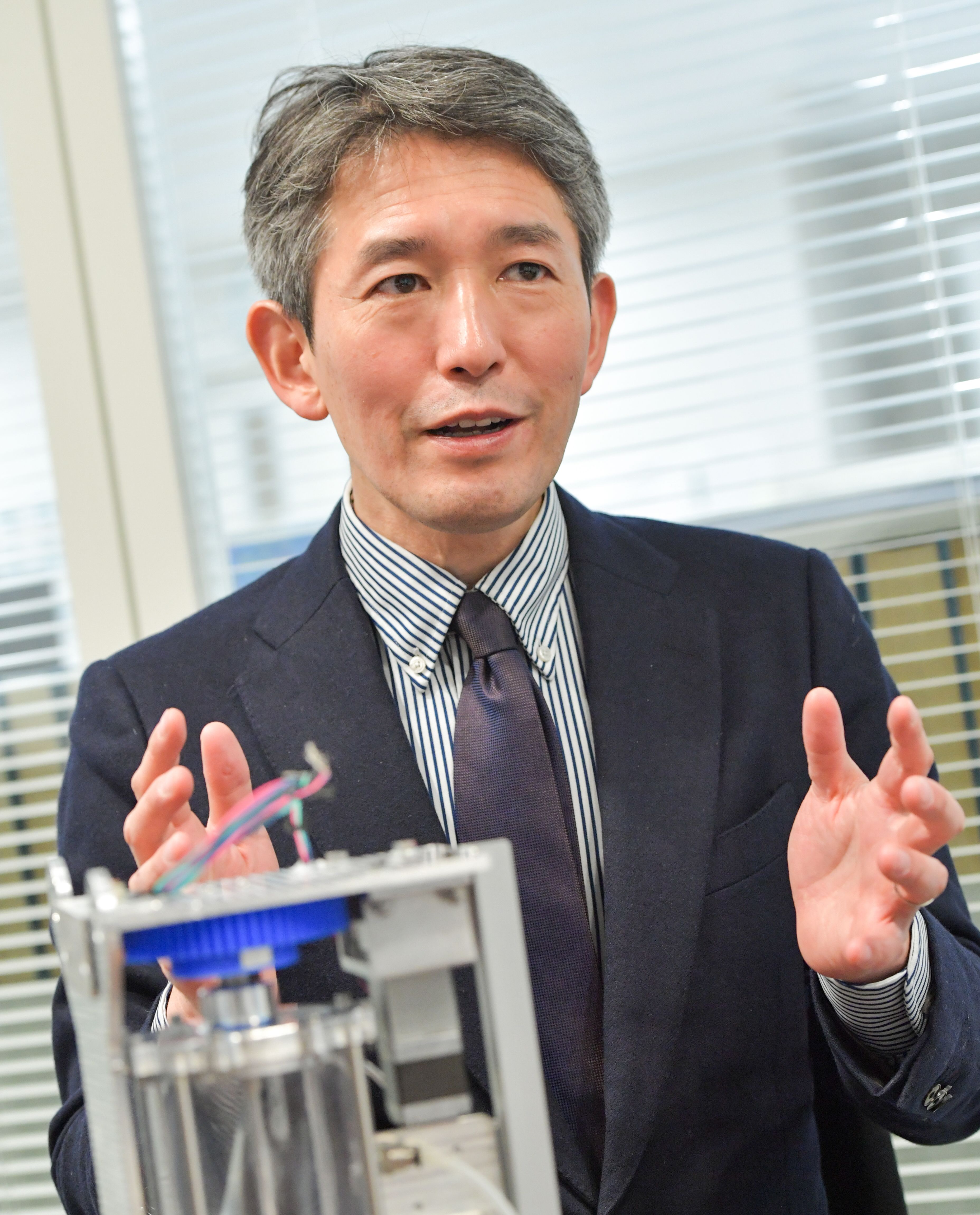 Kazuhiro Sakurai, president and CEO of Asahi Shuzo Co., shows the equipment that will be used for sake-brewing on board the International Space Station.