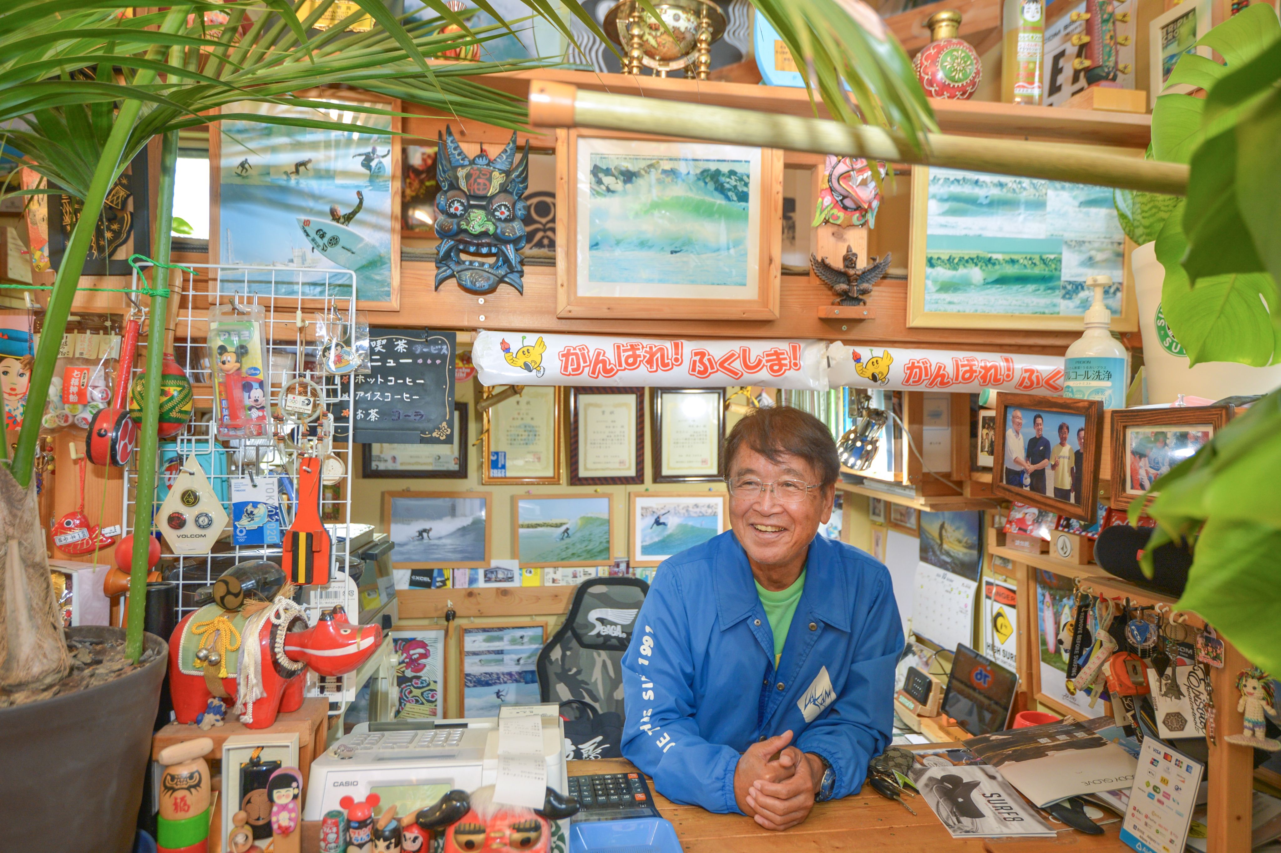 Koji Suzuki at his shop, Surf Shop Sun Marine, in Minamisoma.