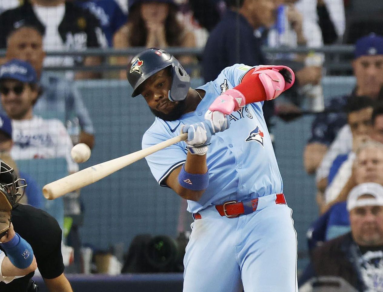 MLB世界大賽第四戰,多倫多藍鳥隊小葛雷諾面對大谷翔平轟出两分砲。2025年10月攝於道奇體育場。(共同社)