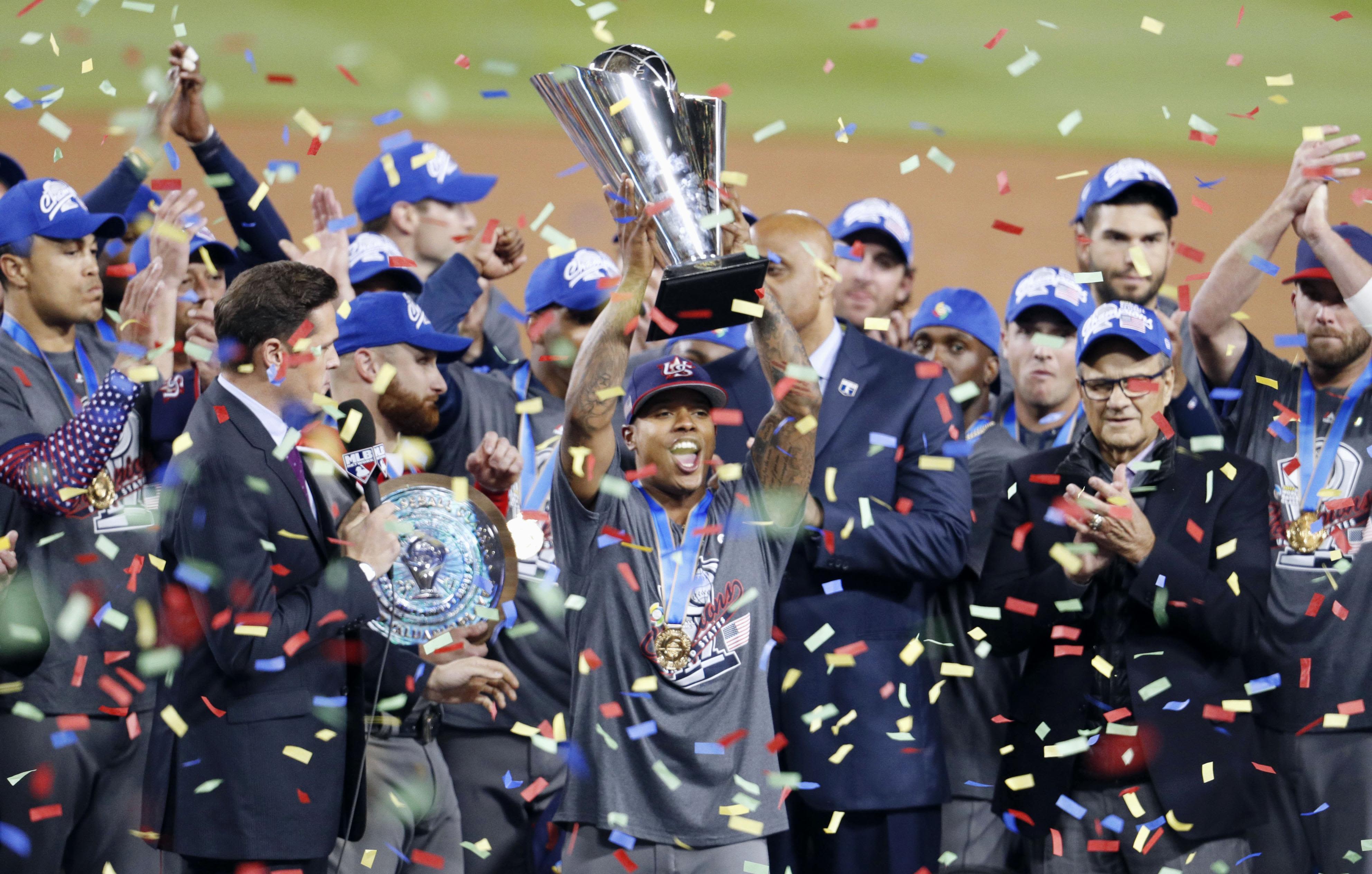美國隊球員慶祝奪冠,史卓曼(Marcus Stroman)高舉獎盃。2017年3月22日攝於道奇體育場。(共同社)