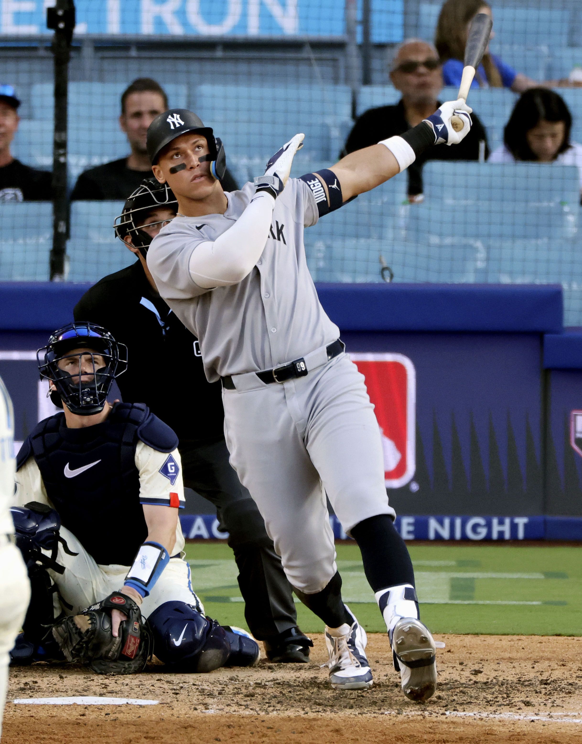 圖為轟出全壘打的紐約洋基隊重砲賈吉。2025年5月攝於道奇體育場。(共同社)