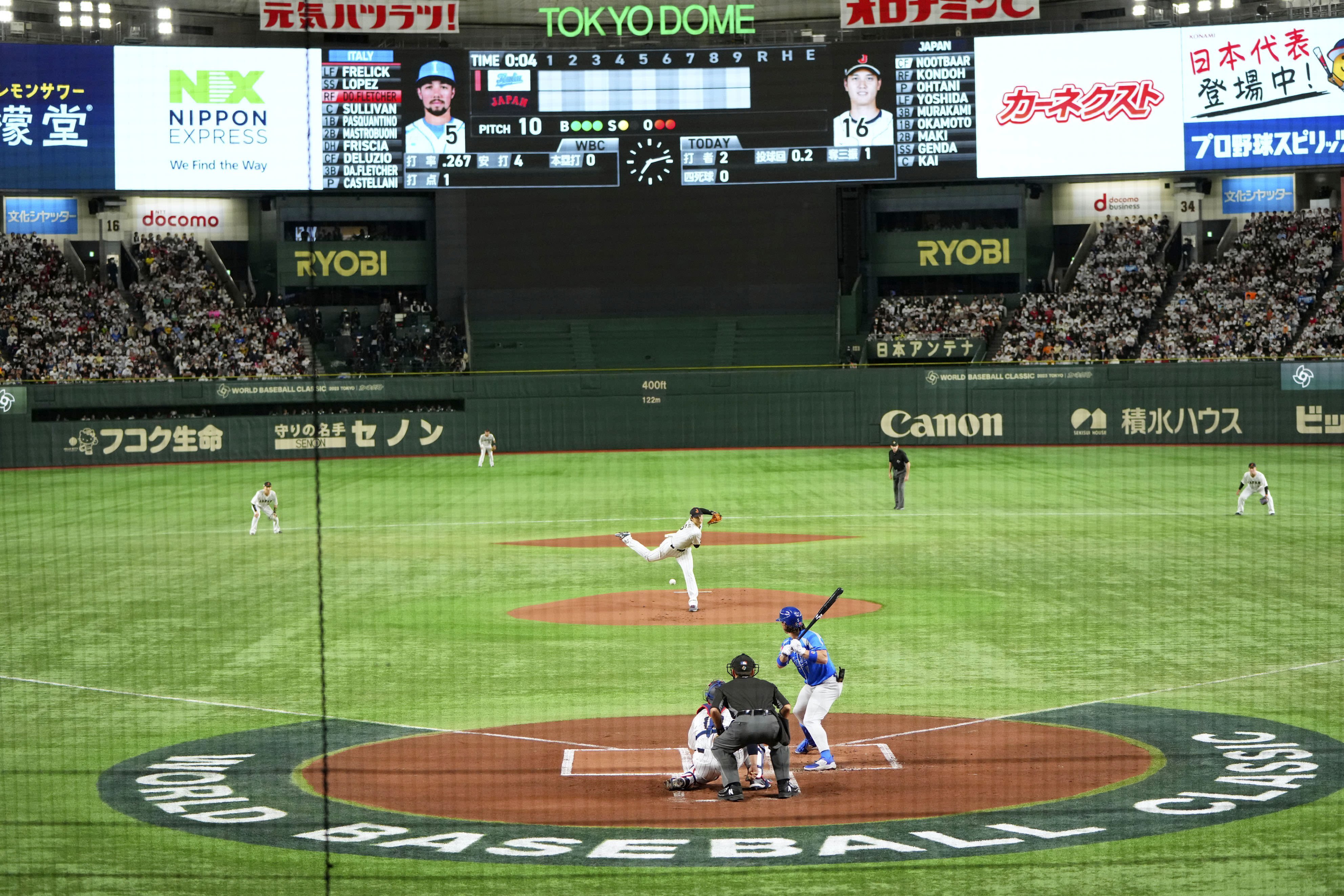 2023年3月16日,第五屆WBC四分之一決賽日本對陣義大利的比賽在東京巨蛋舉行。中央是先發投手大谷翔平。(共同社)