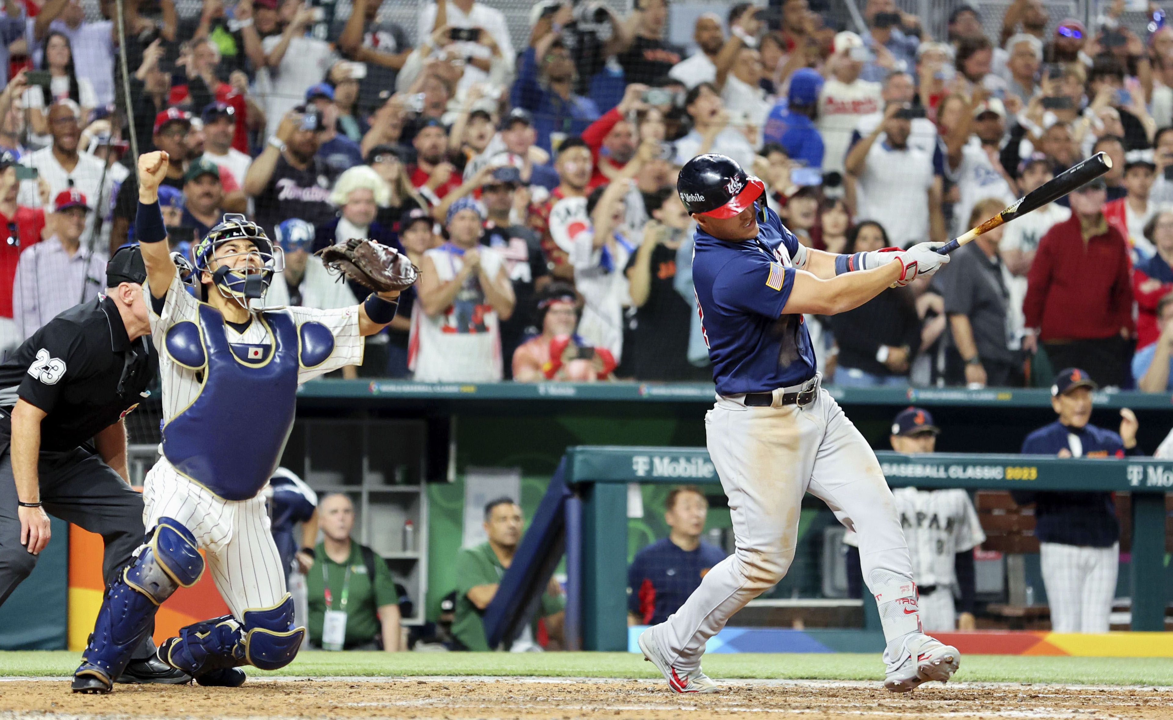決賽第九局,美國隊特勞特被三振出局。2023年3月21日攝於LoanDepot球場。(Getty=共同社)