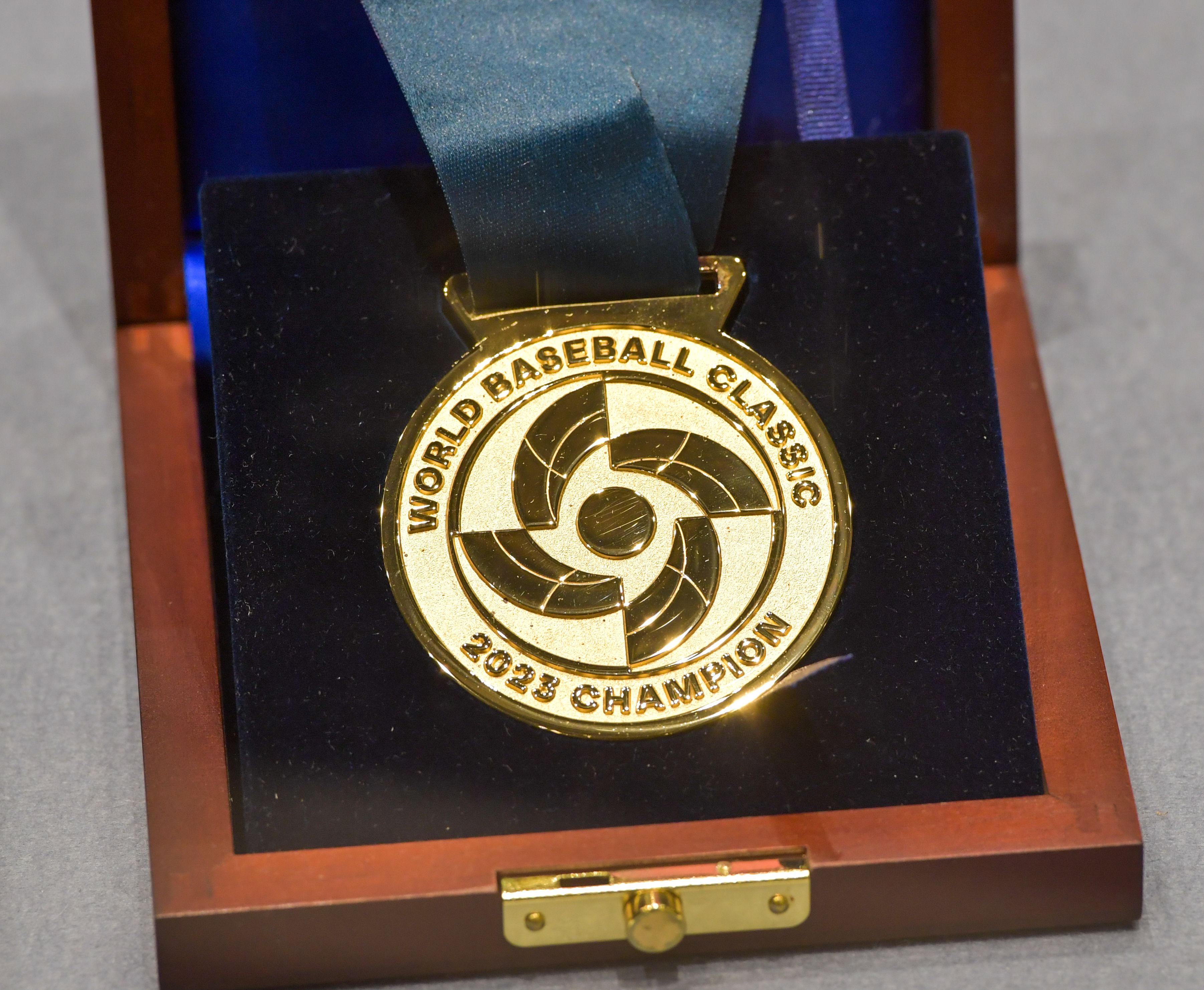 圖為2023年WBC冠軍獎牌。攝於2026年2月。(共同社)